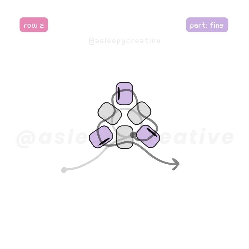 It’s now time to secure it further. The green line represents the right end of the thread, and the purple one represents the left side. Pass your thread separately through the fin as shown to secure it to the body.