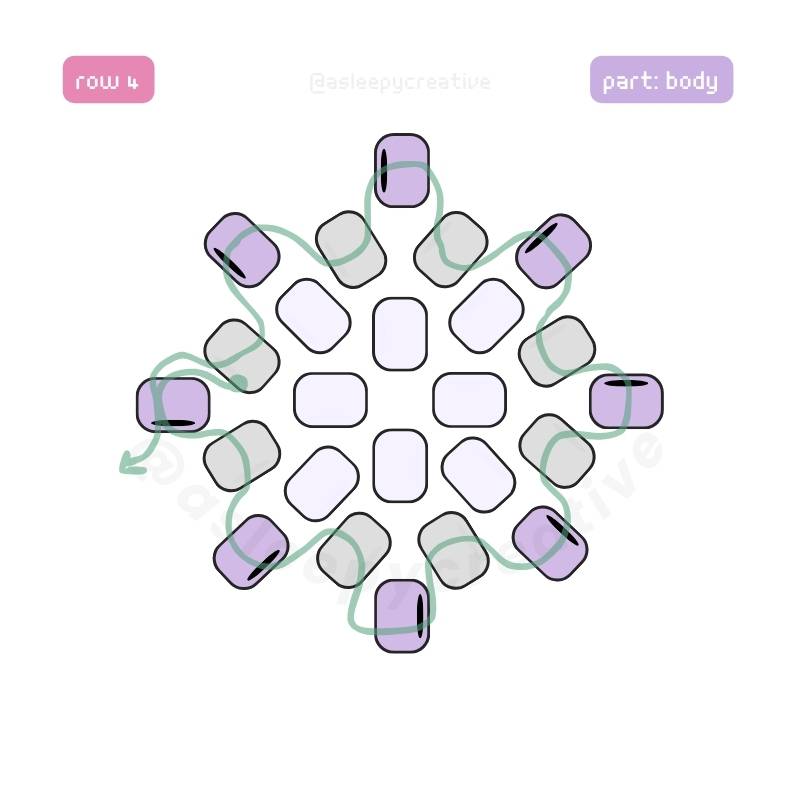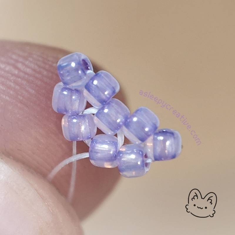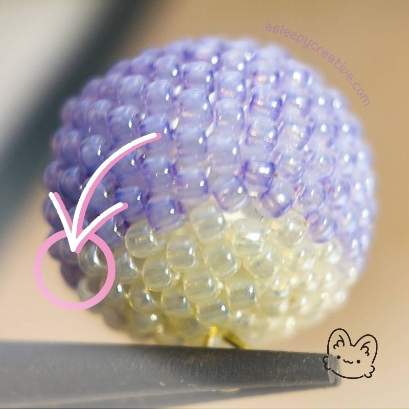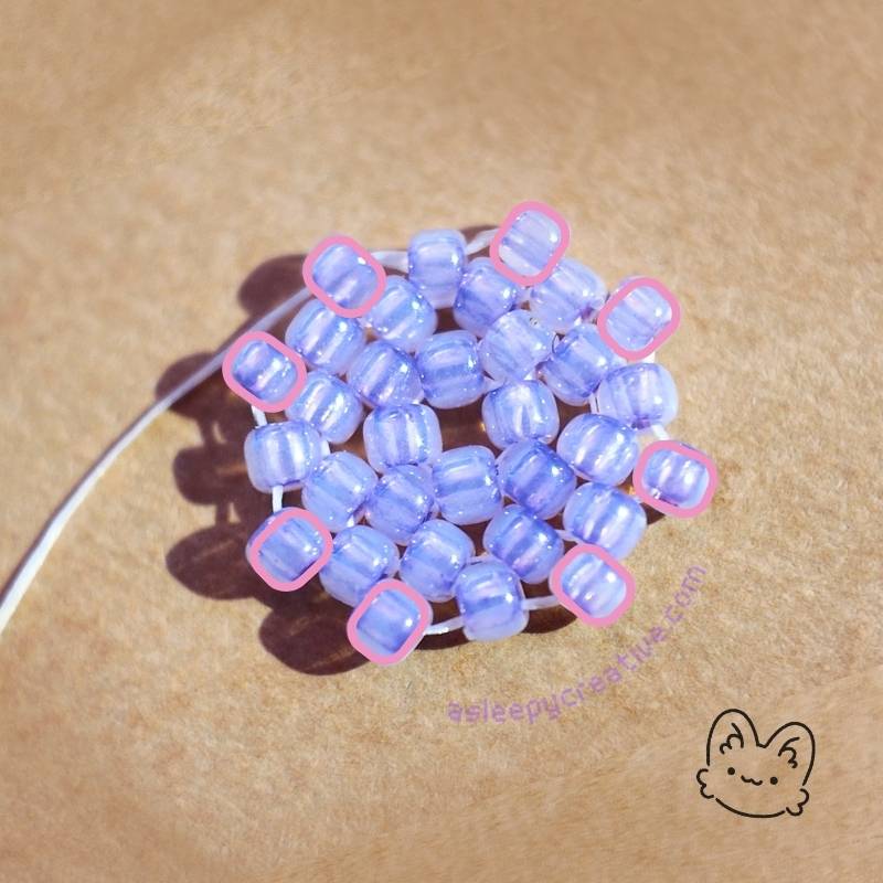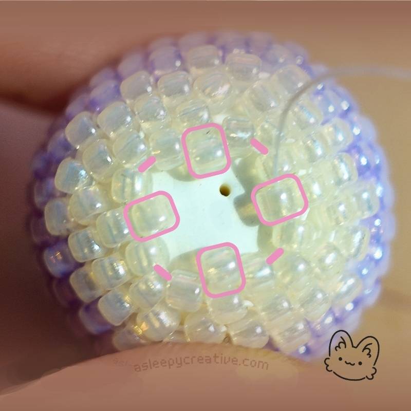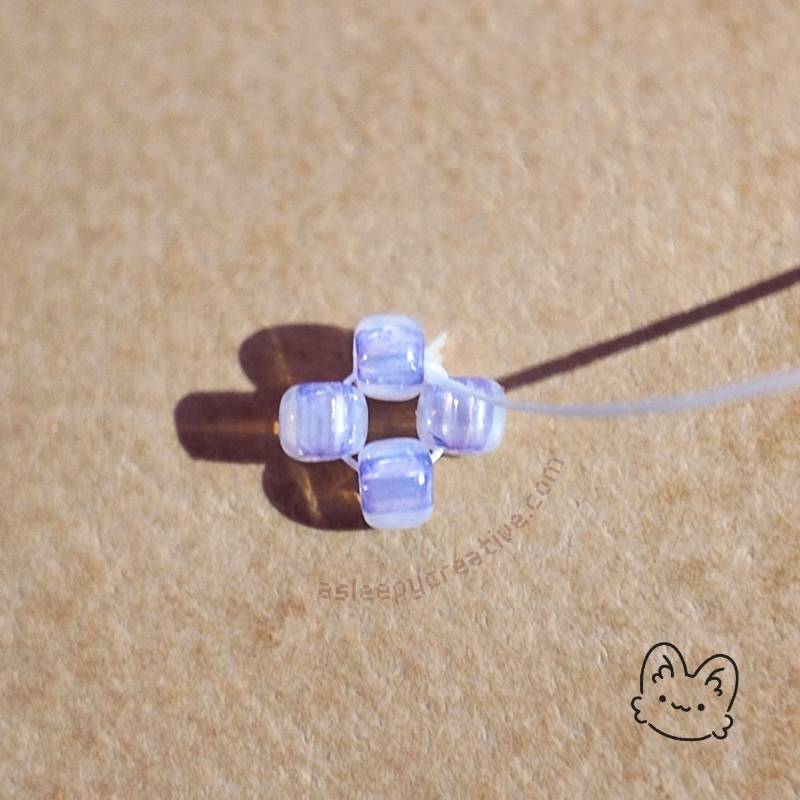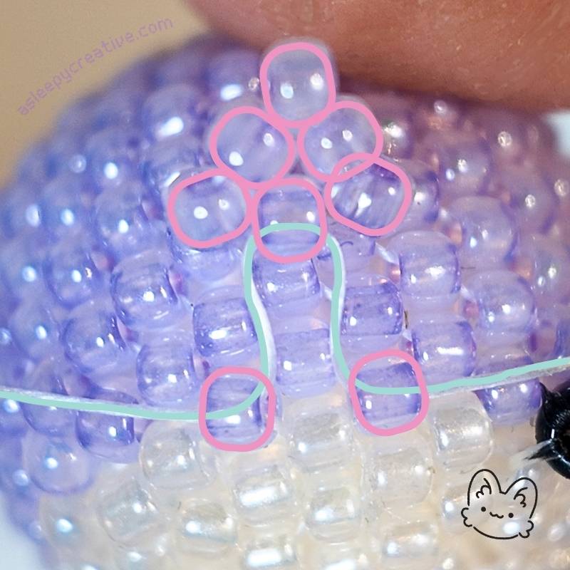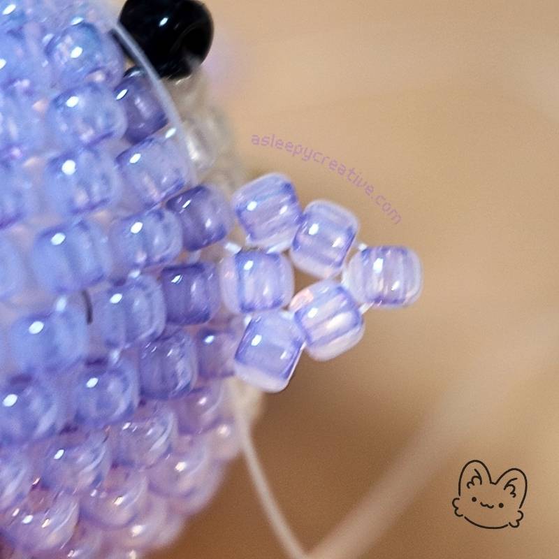 And last row to finish the body, add 1 bead in between the 4 beads added in the previous row. You’ll end up with 4 beads, and a little space in the middle!