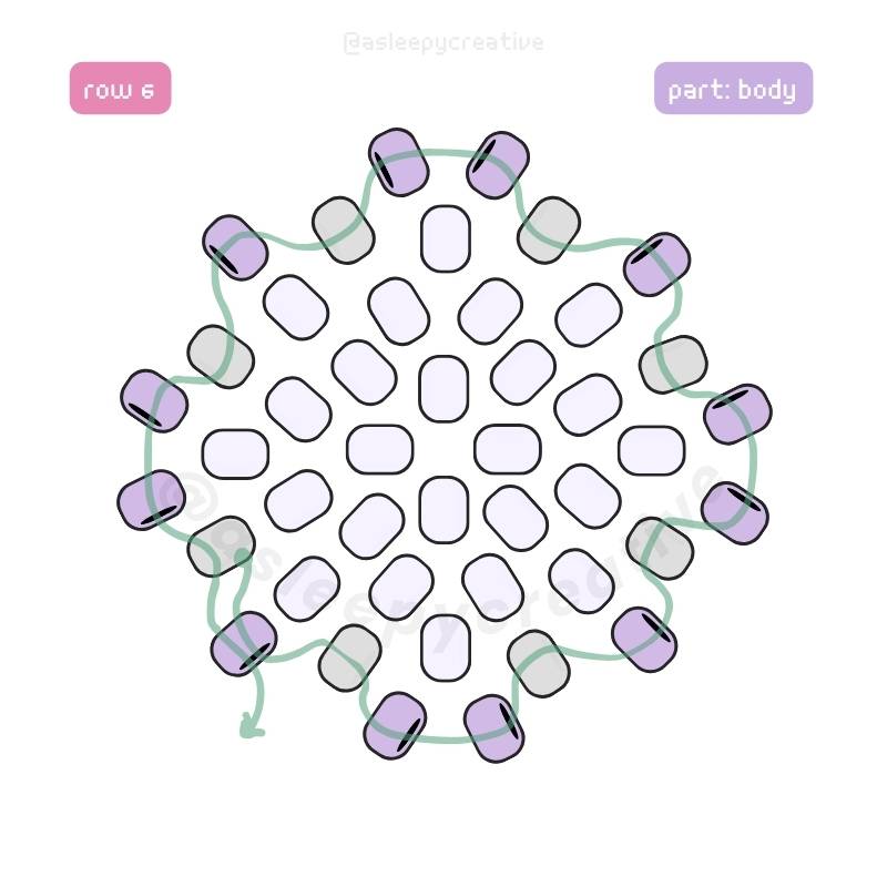 Time to make this sphere grow! This round has increases, but not for every spot! The pattern goes 1 – 2 – 1 – 2 – 1 – 2 – 1 – 2 – 1 – 2 – 1 – 2. Identify where the previous increase is, and increase on top of it. Keep going around until you’ve worked all positions. You’ll end up with 12 beads total.