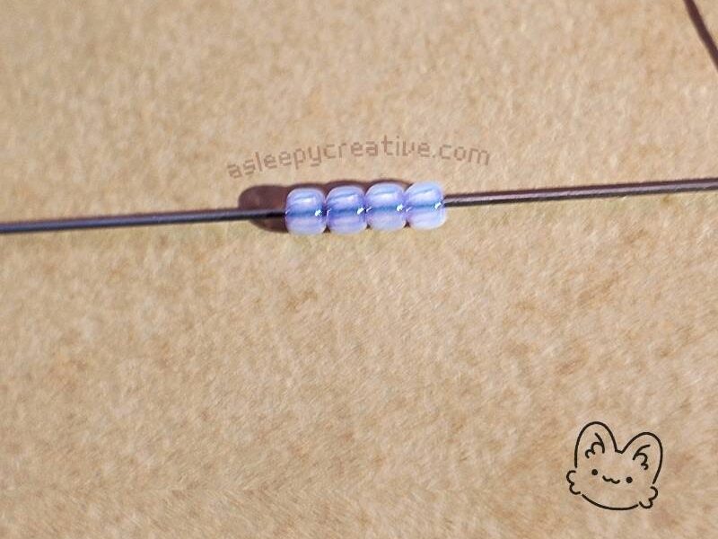 To start buildinging your whale’s foundation, pick up 4 beads and thread them on your needle