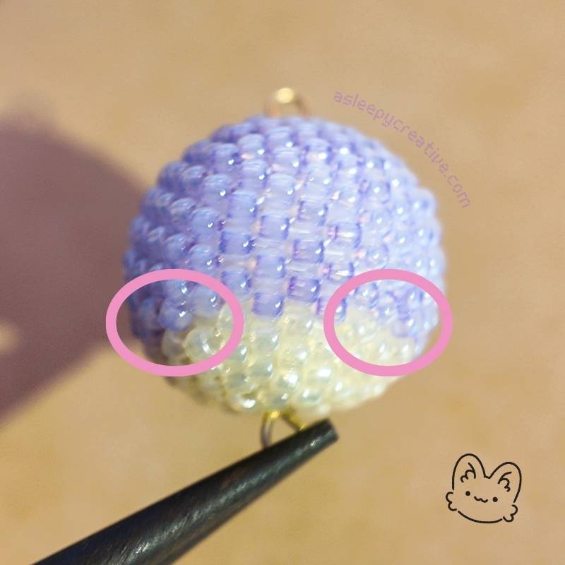 The way you choose the angle of the eye depend on which bead you go through. I wanted downturned eyes, so I passed through the bottom bead. But you can have different results by weaving through the top bead, or by positioning the eyes somewhere else: