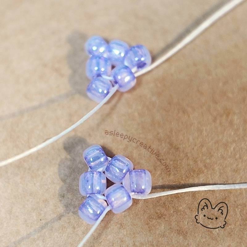 Just like what you’ve done to make the fins, pass 3 beads on your thread, then pass your needle and thread once again through the first bead added to form a little triangle. Make sure the triangle is positioned in the middle of your thread.