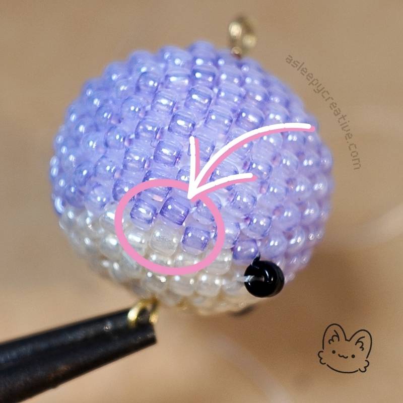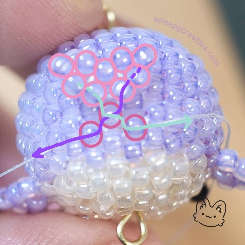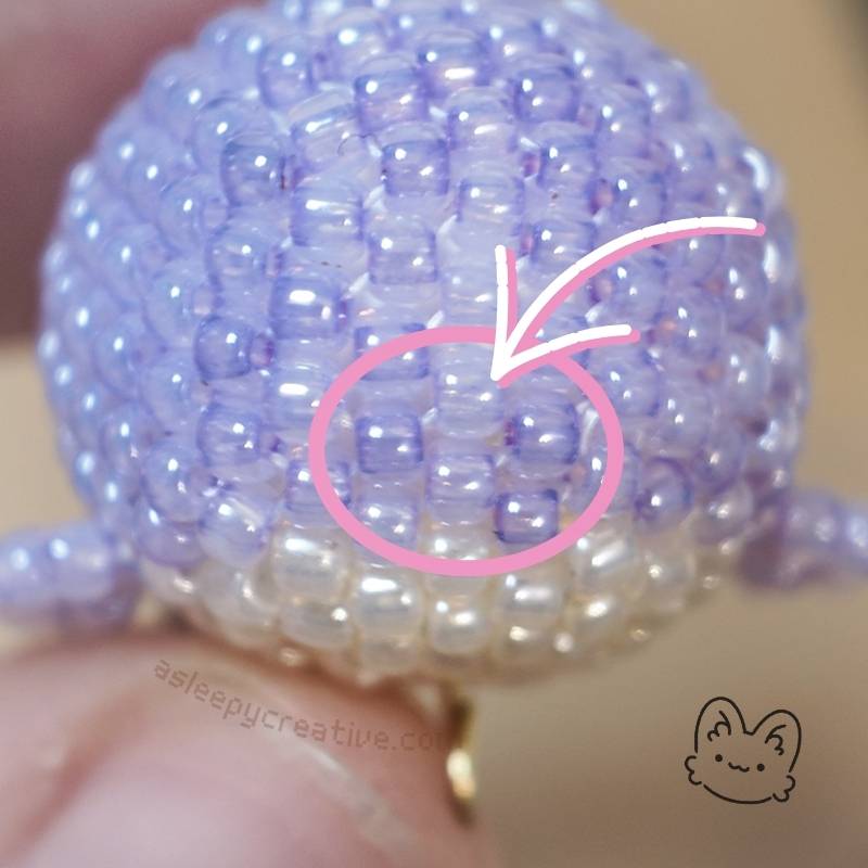 We start by identifying gthe spot we’ll secure the tail onto, at the back of the whale’s body. As previously, I marked the diamond shape created with the 4 beads circled in the pink circle.