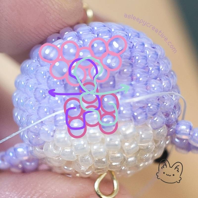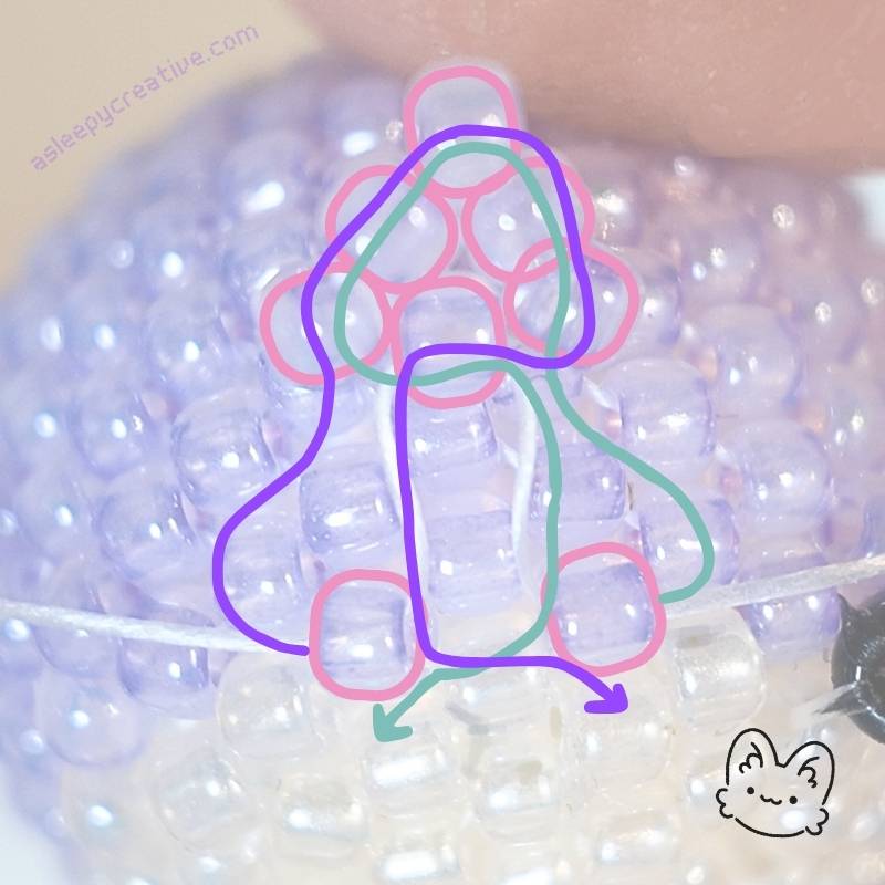 Identify the beads surrounding the area, and thread your way through the beads as annoted on the picture.