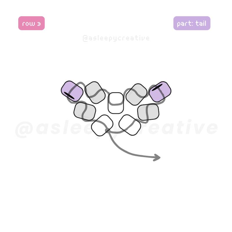 For the third and last row, add one bead on each side of the tail symmetrically, following the diagram.