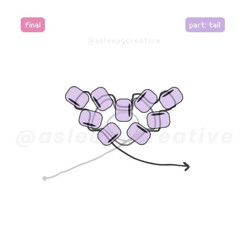 You’ll have to pass both ends of the thread symmetrically in the beads as shown on the picture. I’ve circled the tail’s beads in light pink, and the beads in which you have to pass the threads in dark pink.