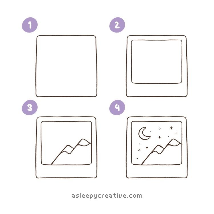 - Draw mountains or any landscape you like inside the polaroid. Here, we’re drawing mountains!
