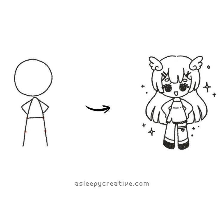 Let’s start up with this one! If you have difficulties, you can trace my drawing at first. I always avoid drawing the hands completely for chibis, as it adds a layer of complexity that is not really useful in chibis, especially for a list of easy drawing ideas.