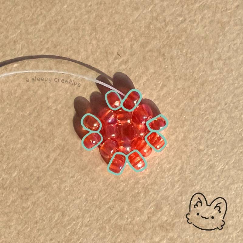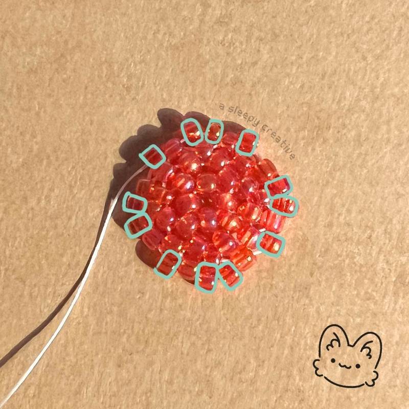 Another increase round, but this time alternating. Add 1 bead, then 2 beads, then 1, then 2, and so on around. You now have 12 bead positions. (pattern: 1-2-1-2-1-2-1-2)