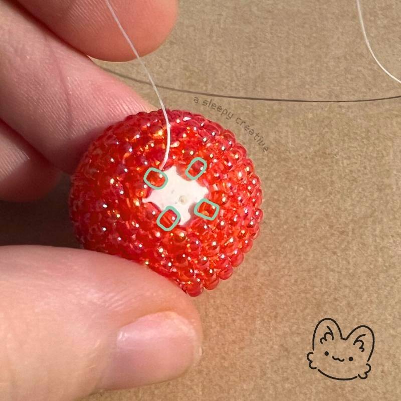 Our last row to wrap up our beaded ball. Thread 4 beads by passing through the beads of the previous row, as usual. And you’re done! (pattern: 1-1-1-1)