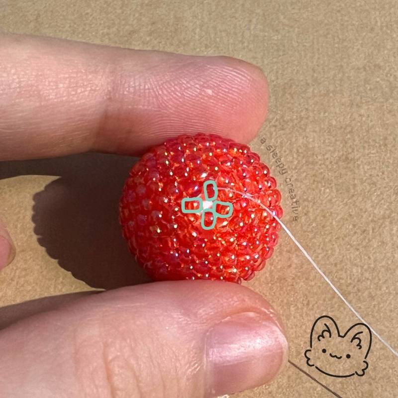 Gaps are the most common issue with beaded spheres, especially at increase points. The main causes are loose thread tension and the natural geometry of increases. To minimize gaps: keep your tension firm and consistent, use slightly different sized individual beads at increase points, or add size 15° seed beads between increases. Personally, I have little to no gaps thanks to the choice of bead (I select slightly thicker or thinner bead depending on where I am in the work). Since the 11/0 round seed beads are not 100% consistent in size, it’s easy to do!