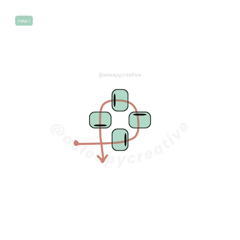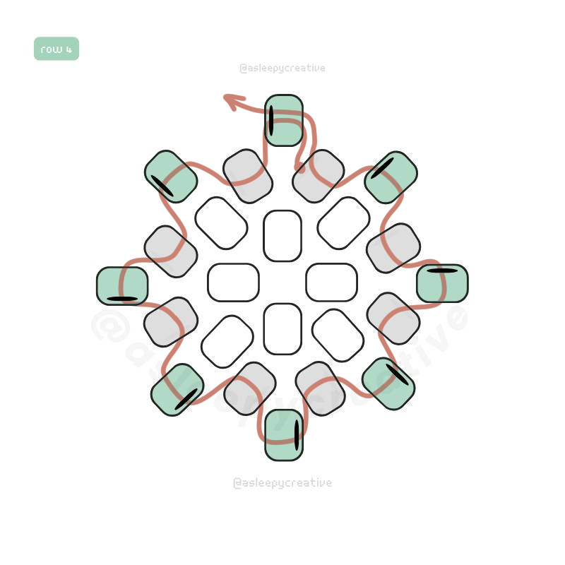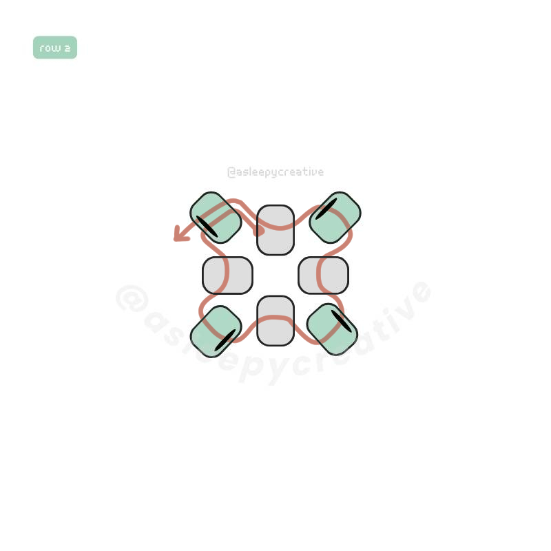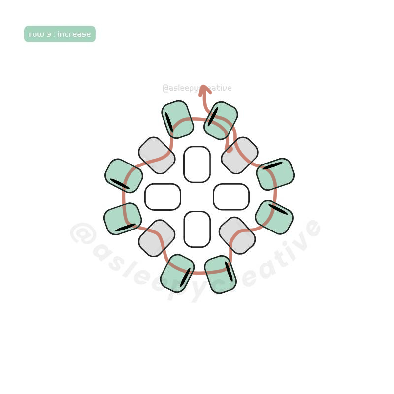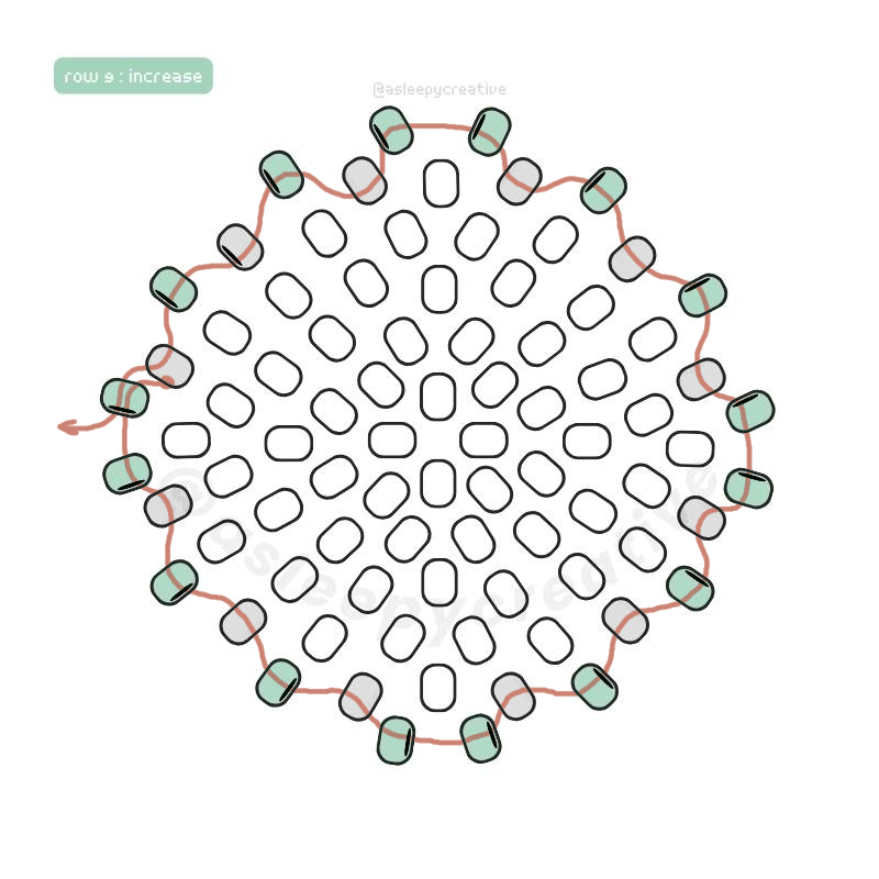 On the picture, you can identify the previous increases with purple x’s. I like keeping them in mind since I stack both my increases and my decreases. It is absolutely not mandatory, but it allows me to keep my counting easy and the work clean, I feel like.