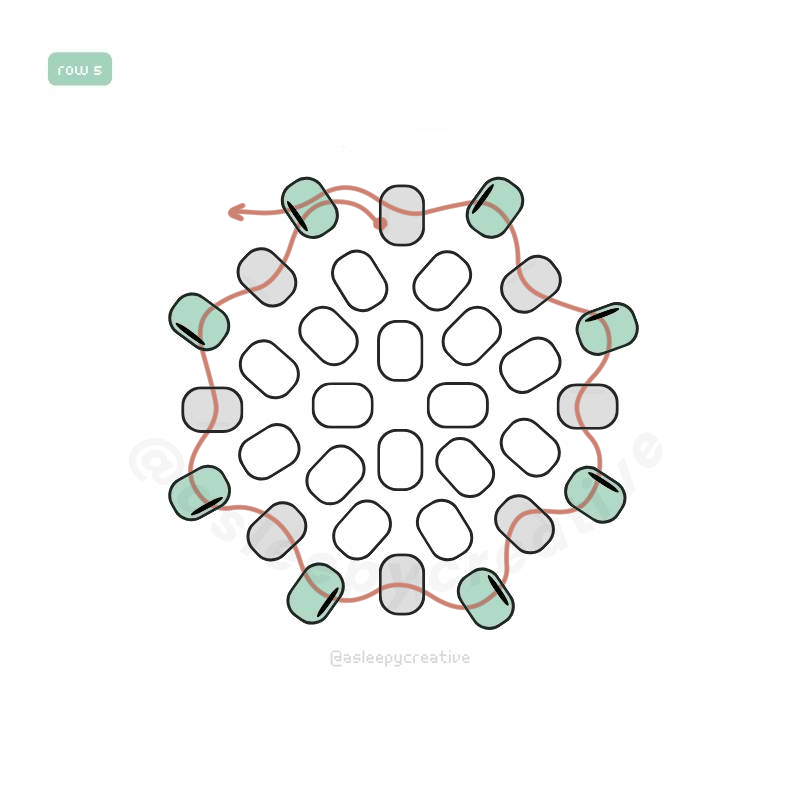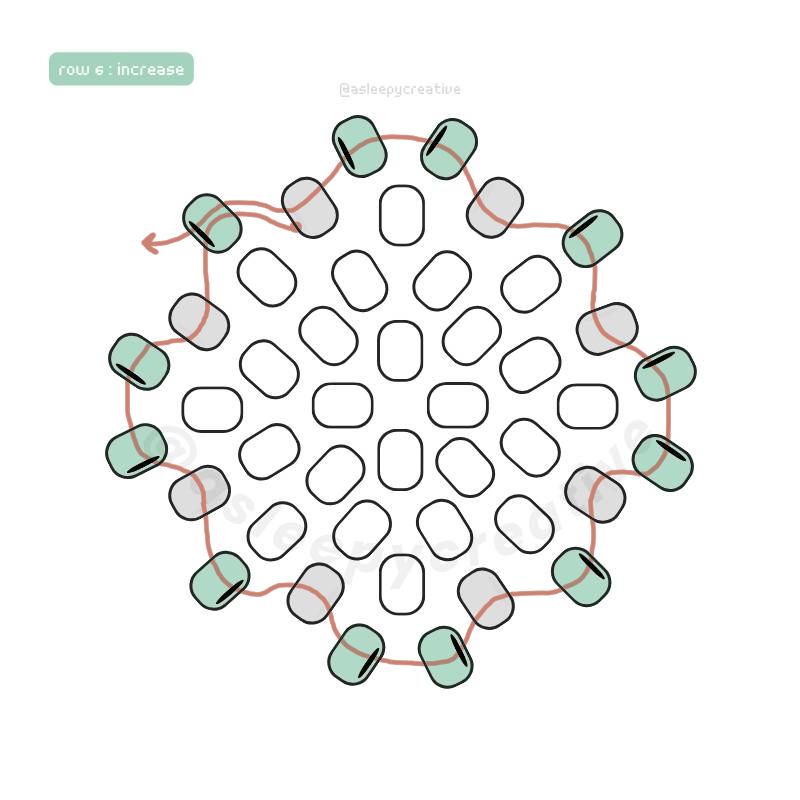 Alternate 2 beads and 1 bead as follows: 2 on top of the previous increases, 1 in between. (pattern: 2-1-1-2-1-1-2-1-1-2-1-1)