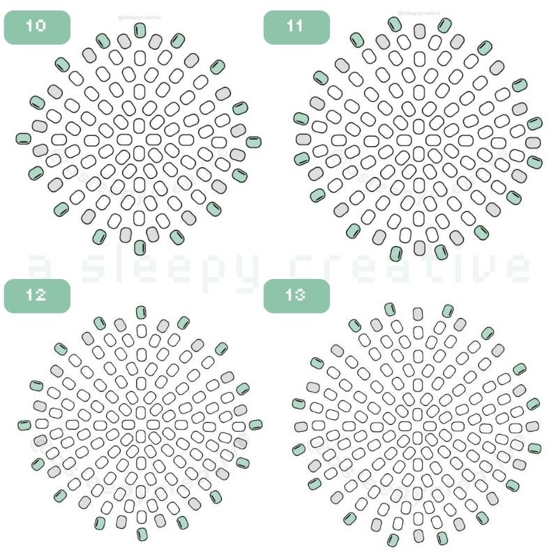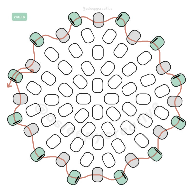 And same for row 8! The last row before our last increase. As for row 7, add one bead between each of the previous row’s beads. (pattern: 1-1-1-1-1-1-1-1-1-1-1-1)