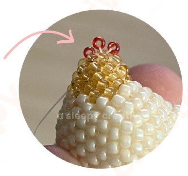 Add the three red beads one by one. Add one, then loop through the surrounding beads and A to secure it. Then do the same for the other two beads until you have three red beads on top of your chicken’s head: