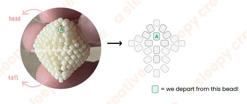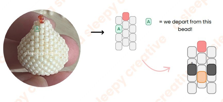 Now that the chicken body is done, let’s make the comb. Place yourself at bead A. You’ll need to loop through that bead multiple times to create a comb with 3 red beads.