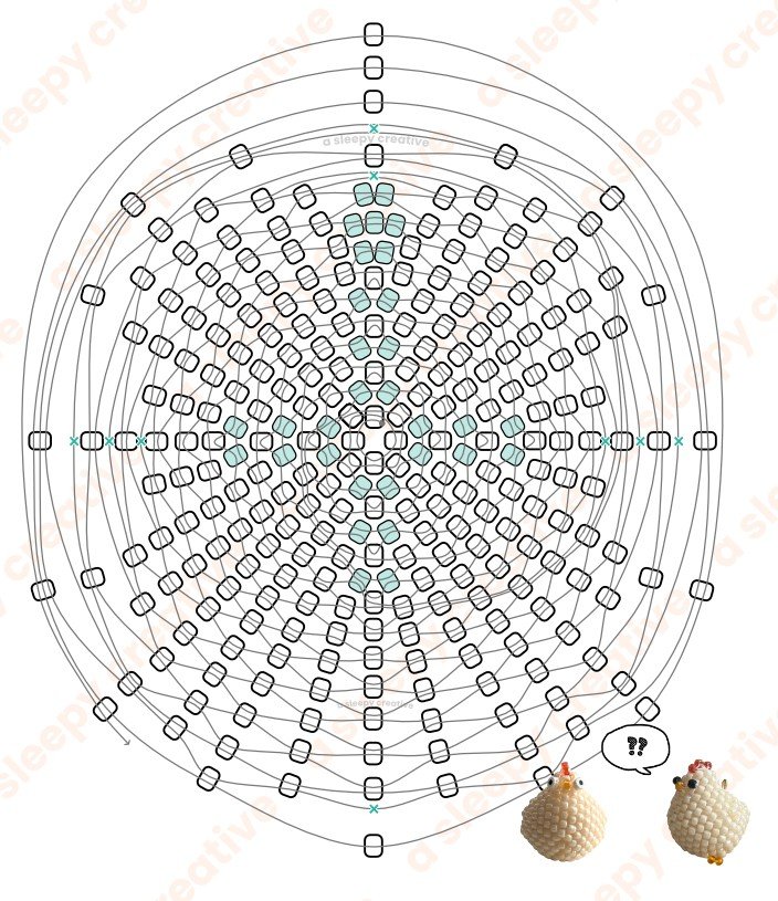 The beads colored in turquoise show the increases or spots where the pattern differ from regular circular peyote stitch round.