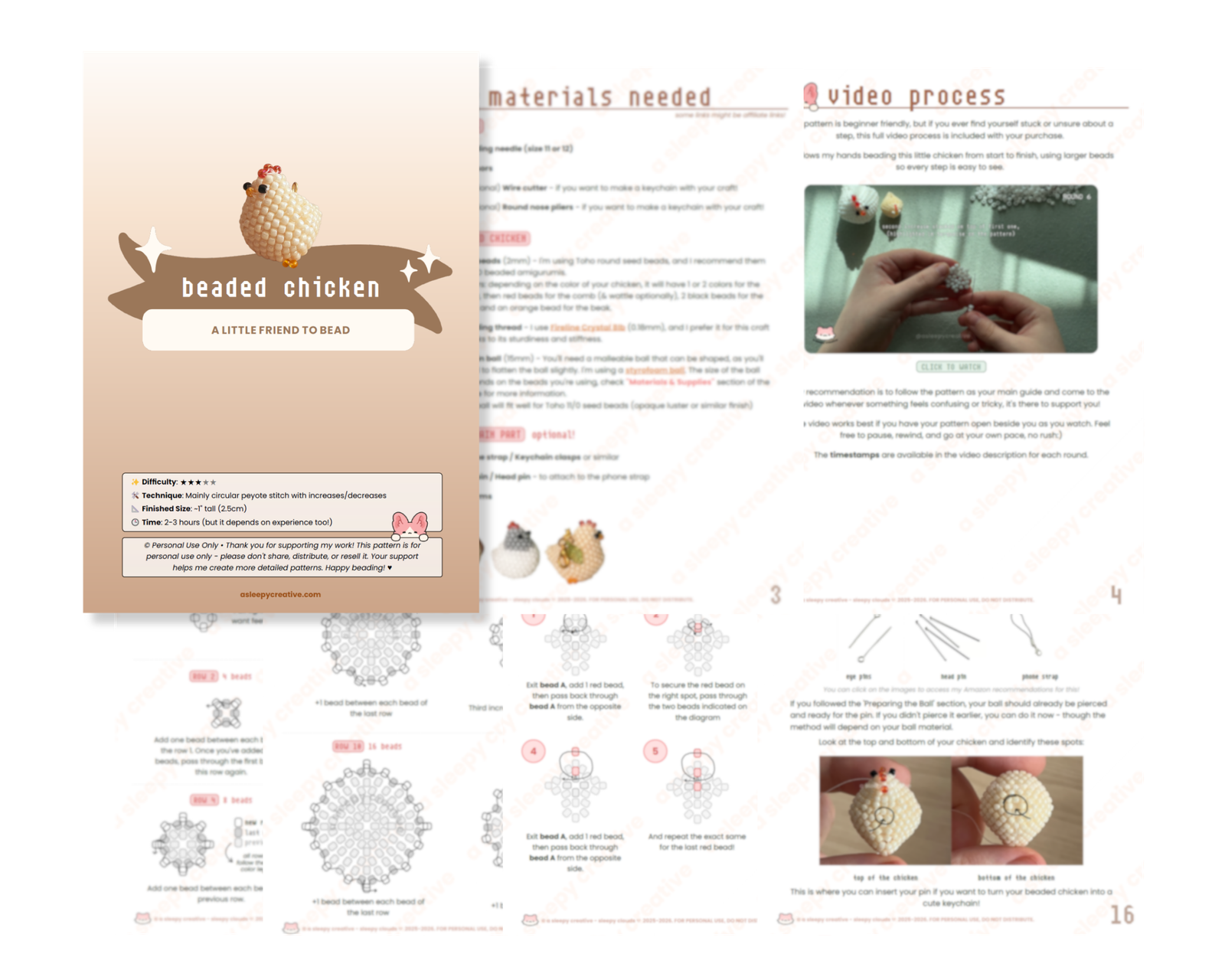 It is a 20 pages PDF file with explanations, diagrams and pictures to guide you step by step and help you make your first chicken keychain.