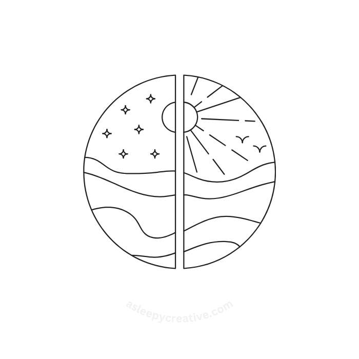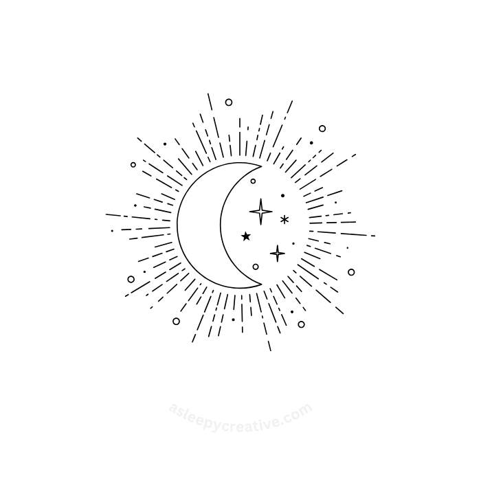 This one is so clean and satisfying to look at. A moon overlapping the sun with sparkles floating around. It has that balanced and calming vibe. Great for beginners and perfect for celestial-themed doodling. You can’t really make easier than this one I think!